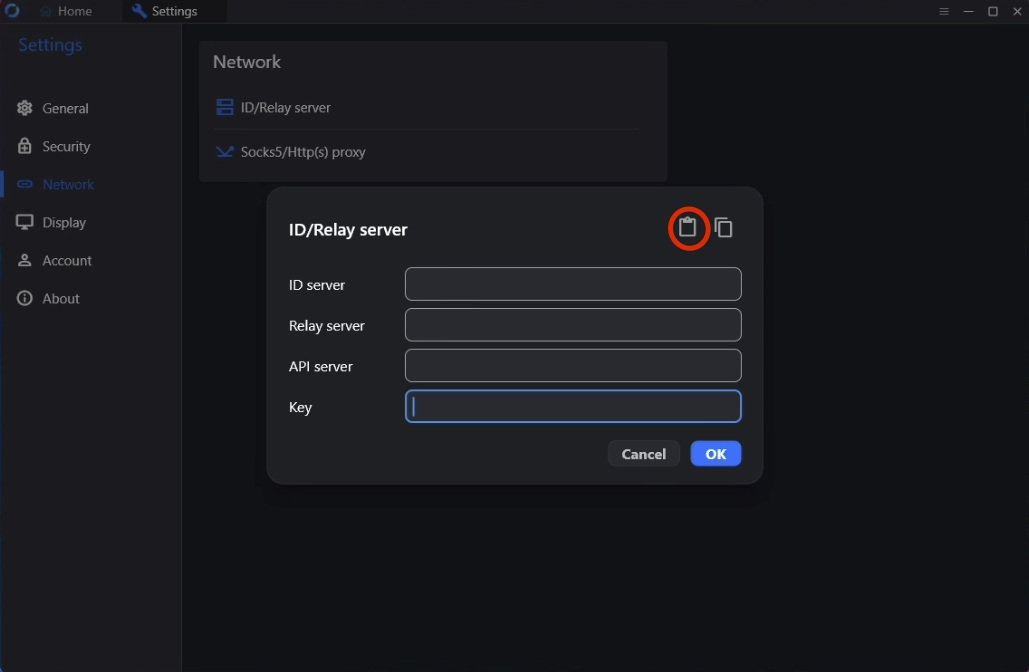 Po inštalácií treba prejsťcez … vedľa ID na nastavenia programu prejsť na Netwrok, rozkliknúť ID/Relay server – môže to od Vás žiadať potvrdenie admina, alebo zadať login s a heslo správcu pre prístup k tejto konfigurácii.